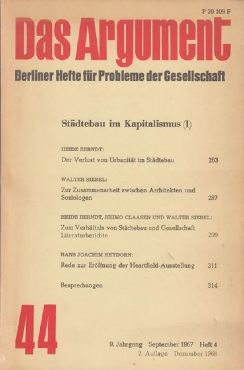Titel: Das Argument. September 1967, 9. Jahrgang, Heft 4, No. 44 der Gesamtfolge. Berliner Hefte für Probleme der Gesellschaft. - aus dem Inhalt: Heide Berndt - Der Verlust der Urbanität im Städtebau / Walter Siebel: Zur Zusammenarbeit zwischen Architekten und Soziologen / Hans Joachim Heydorn: Rede zur Eröffnung der Heartfield-Ausstellung.