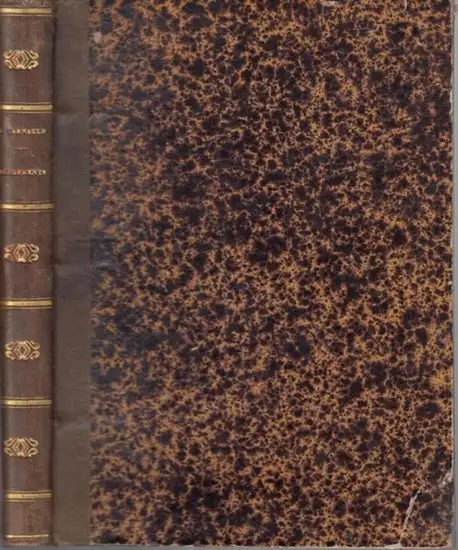 23,5 x 18 cm. Demi-bracelet en cuir de l'époque avec titre au dos et décorations en gaufrage doré et papier de référence à motifs marron. Les coins et les bords sont un peu bosselés, le cuir avec de légères traces d'abrasion. 164 pages avec les lettres pastorales d'Henry Arnauld et (6) 103 pages avec les instructions de saint Charles Borromée, archevêque de Milan pour ses confesseurs. Les intentions avec un motif rouge-vert, la page de titre des mandements avec les armoiries gravées d'Henry Arnauld sur la page de titre, les instructions également avec un blason gravé sur la page de titre. Le livre entier avec de jolies moulures de tête gravées et des vignettes de fermeture. Le Privilège du Roy à la page 103 des Instructions avec une date manuscrite. Propre, bon etat. --- Halblederband der Zeit mit Rückentitel und Verzierungen in Goldprägung und braun gemustertem Bezugspapier. Ecken und Kanten sind etwas bestoßen, das Leder mit leichten Abriebspuren. 164 Seiten mit den Hirtenbriefen des Henry Arnaulds und (6) 103 Seiten mit den Hinweisen des Heiligen Karl Borromäus, Erzbischof von Mailand für seine Beichtkinder. Die Vorsätze rotgrün gemustert, das Titelblatt der Mandements mit dem gestochenen Bischofswappen des Henry Arnauld auf dem Titelblatt, die Instructions ebenfalls mit einem gestochenen Wappen auf dem Titelblatt. Das ganze Buch mit einigen schönen gestochenen Kopfzierleisten und Schlußvignetten. Das Privilège du Roy auf Seite 103 der Instructions mit einem handgeschriebenem Datum. Sauberes, gutes Exemplar