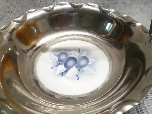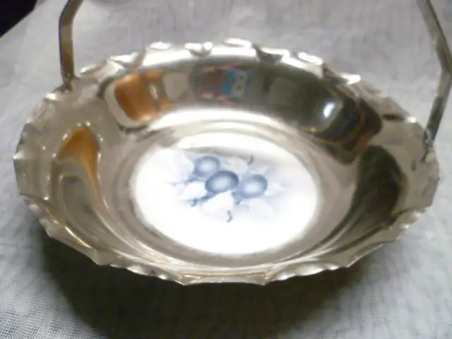 alte verchromte Schale mit Keramikeinsatz. Sie wurde in den 20er Jahren hergestellt. Das Dekor wurde in Spitztechnik aufgebracht. Dekoriert mit Früchten Süßigkeiten etc. ist sie ein auffälliger Blickfang .