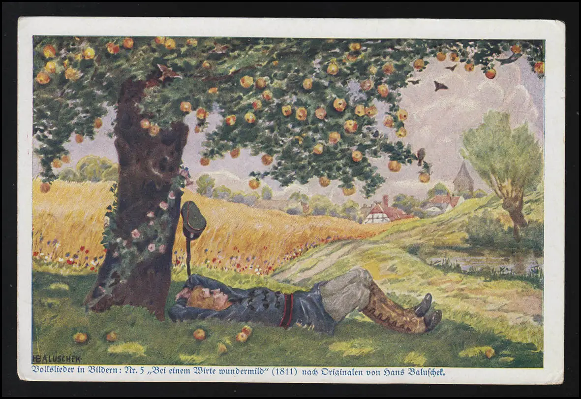 Artiste AK Hans Baluschek Soldat sous pommier Volkslieder SCHWEINFURT 9.4.18