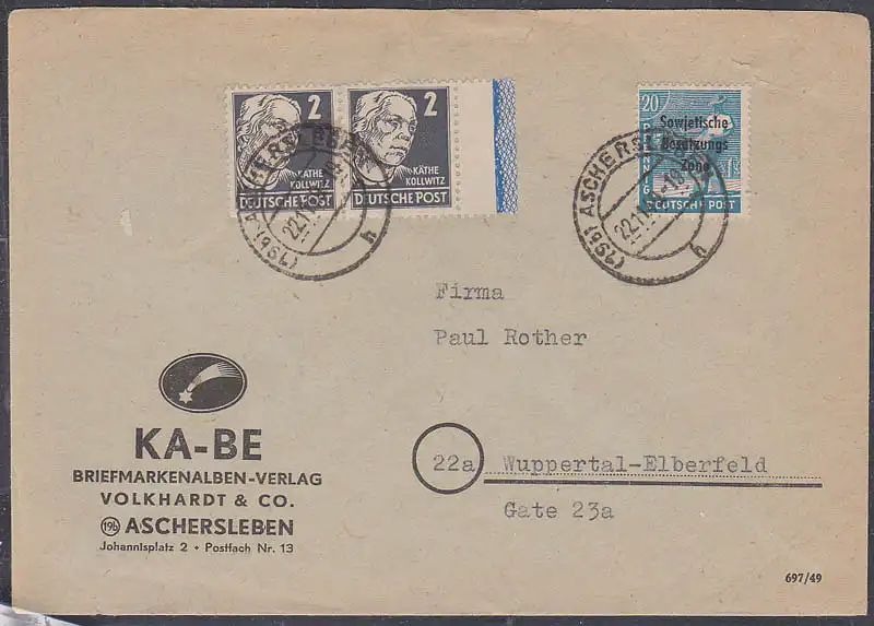 Aschersleben Fern-Bf mit 2 Pfg Käthe Kollwitz mit Randleiste rechts, 22.11.49 (212)