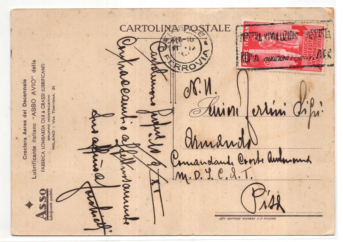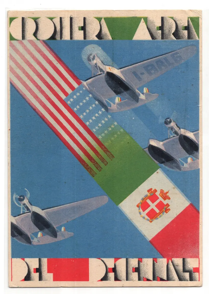 Postkarte - Farbkarte Gruppe Montecatini Milanocon Wasserflugzeug Italo Balbo im Flug (Longkatalog Nr. 2986, Kat. Arturo Ciaglia Nr. 81) - perfekt gereist - dies ist eine der seltensten Postkarten der zehnjährigen Flugkreuzfahrt Cod. 3519/WEB