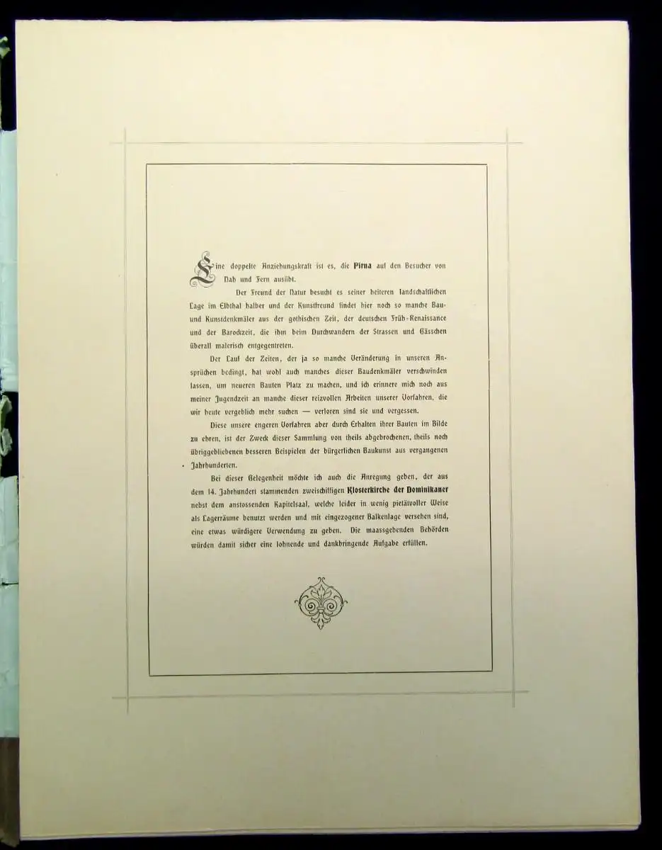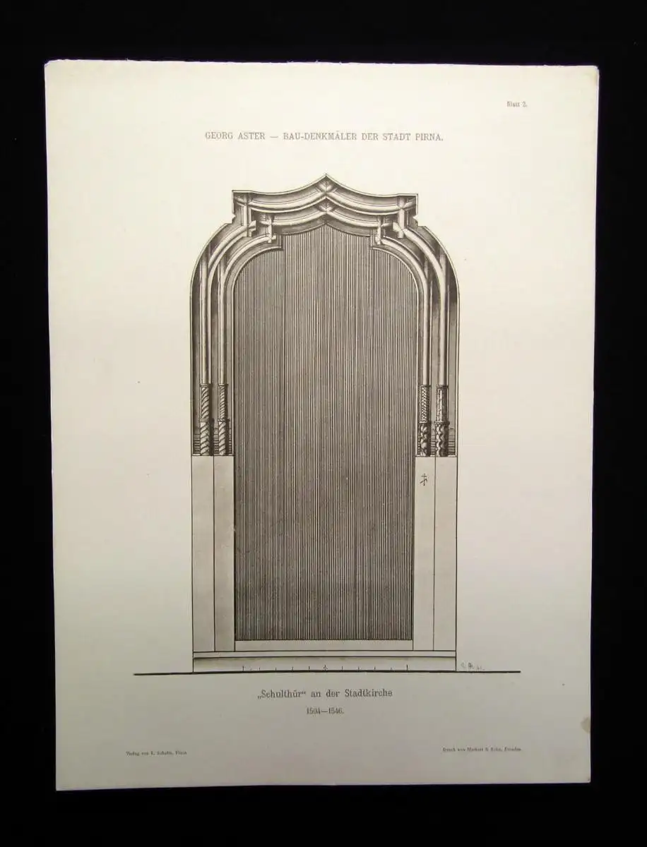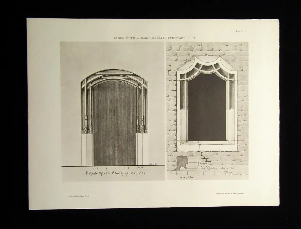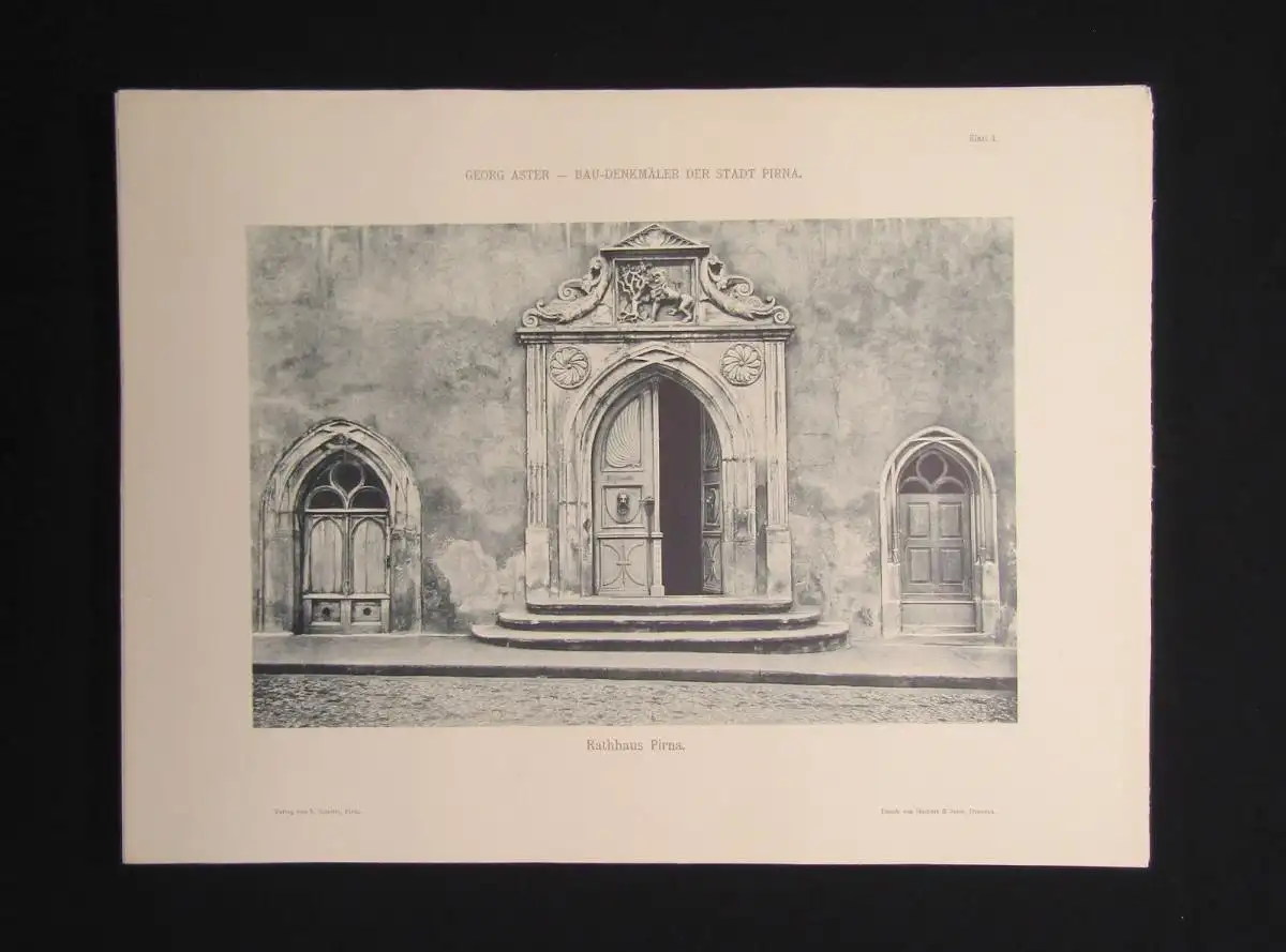 Aster, Georg Bau-Denkmäler der Stadt Pirna aus dem 15.-17.Jahrhundert Mit 20 Tafeln Scholtz - 1902 Sprache: deutsch Größe: 2 ° (ca. 38 cm x 29 cm) Kollation/Einband: Titel, 1 Bl., 4 S., 20 Tafeln.; Or. Schuber, Pappband Zustand: Or. Schuber fleckig und stärker bestoßen, Or. Umschlag beschädigt, mit Fehlstellen und einrissen. Blätter gering gebräunt. Bilder sind Bestandteil der Zustandsbeschreibung. Zustand wurde bereits im Preis berücksichtigt.