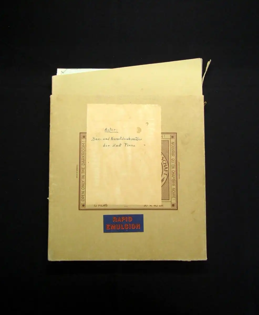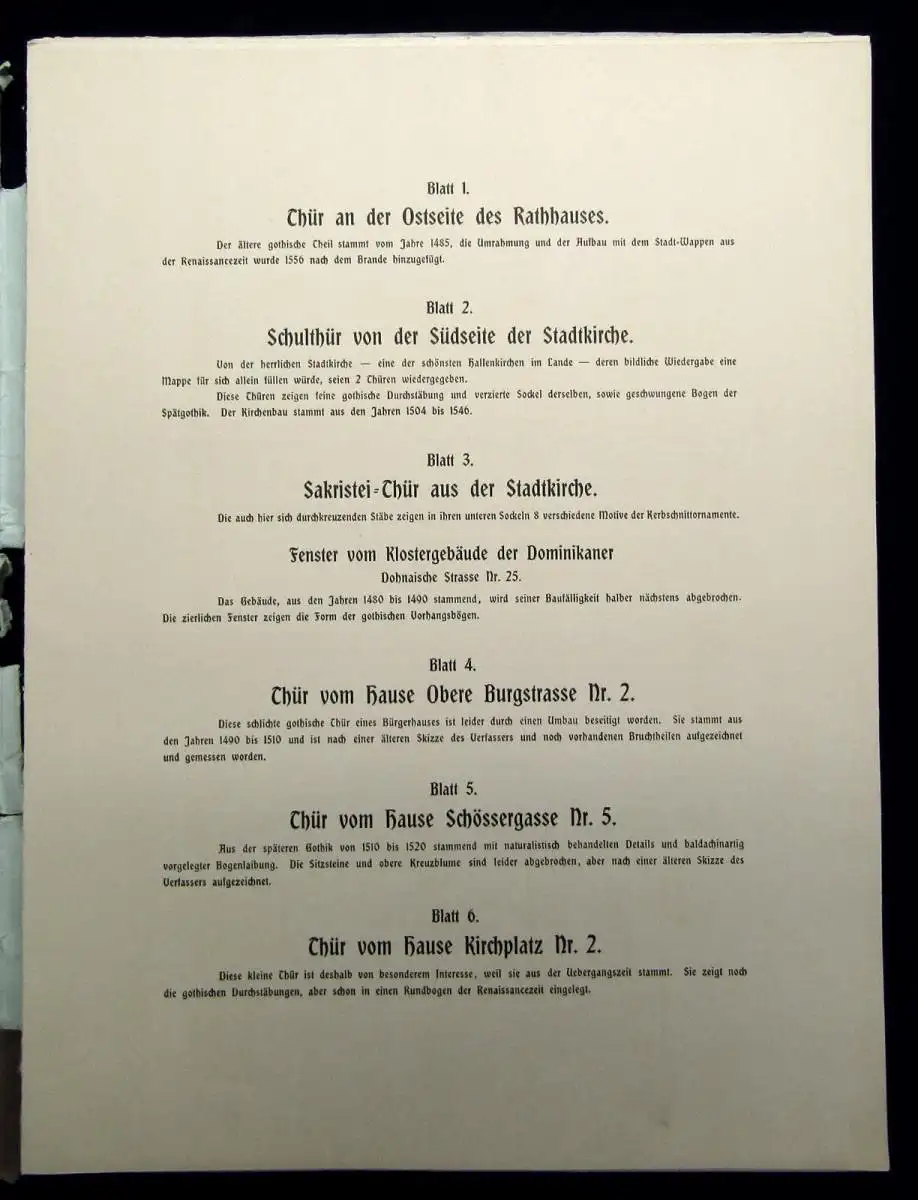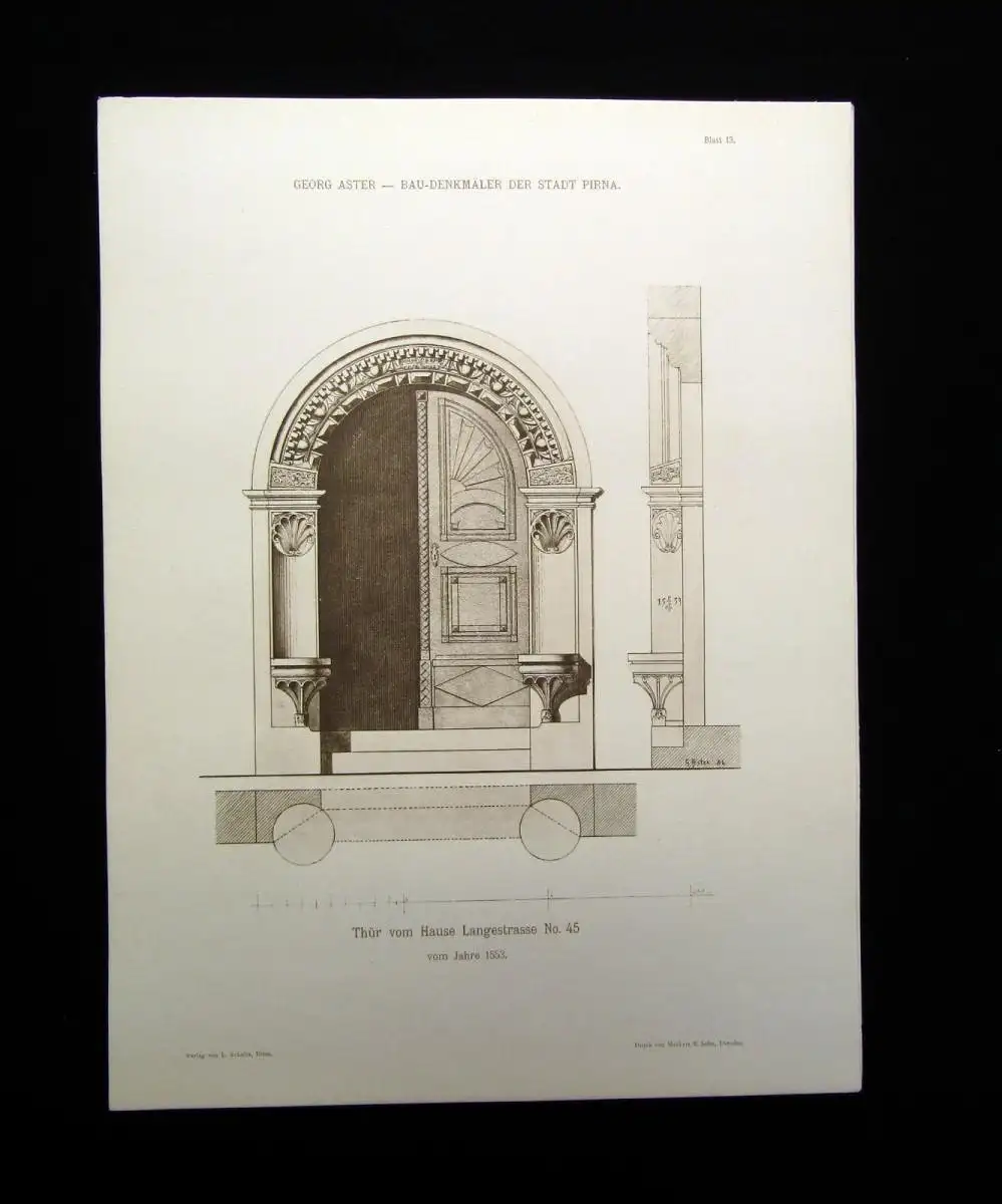 Aster, Georg Bau-Denkmäler der Stadt Pirna aus dem 15.-17.Jahrhundert Mit 20 Tafeln Scholtz - 1902 Sprache: deutsch Größe: 2 ° (ca. 38 cm x 29 cm) Kollation/Einband: Titel, 1 Bl., 4 S., 20 Tafeln.; Or. Schuber, Pappband Zustand: Or. Schuber fleckig und stärker bestoßen, Or. Umschlag beschädigt, mit Fehlstellen und einrissen. Blätter gering gebräunt. Bilder sind Bestandteil der Zustandsbeschreibung. Zustand wurde bereits im Preis berücksichtigt.