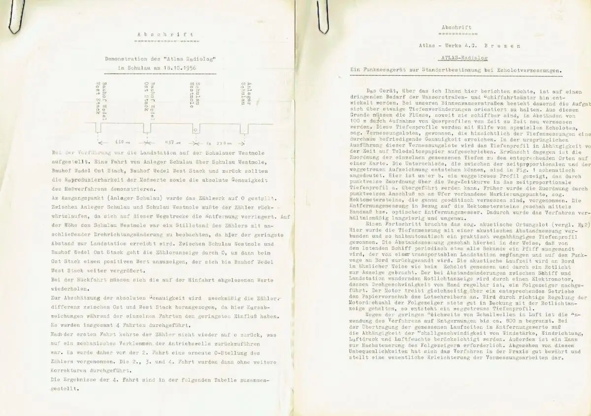 guter Zustand, geringe Gebrauchs- und Alterungsspuren: Prospekt quer gefalten und teils leicht knittrig - Beilagen vergilbt und teils mit kleinen Randblessuren - kleine Beilage zudem gelocht, Prospekt mit Beschreibung, technischen Daten und Vorteilen, dazu 3 Beilagen: Abschrift Atlas-Radiolog Funkmessgerät, Abschrift einer Demonstration des Atlas Radiolog in Schulau am 18.10.1956 (zus. 6 Blatt) und einer Fotokopie zum Thema Ultraschall und Infraschall (2 Blatt A5), Papier, ca. 21 x 29,5, 4 Seiten mit 6 Bildern + 3 Beilagen mit zus. 8 Seiten Text, davon 2 Blatt in Größe A5