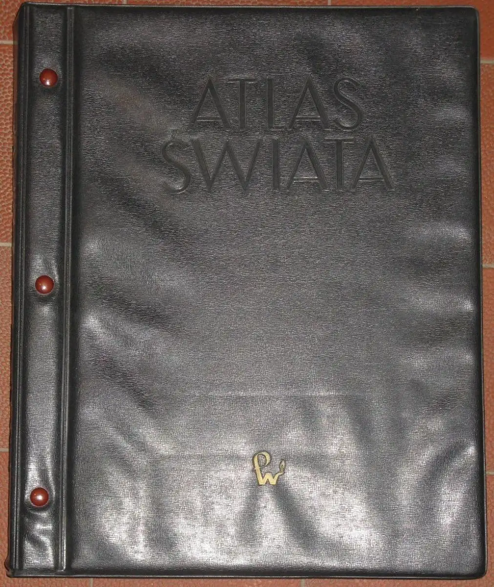 noch sehr guter Zustand, geringe Gebrauchs- und Alterungsspuren: 2 der 3 Schrauben sind nur noch zur Hälfte vorhanden, sie können also nicht mehr verschraubt werden, Atlas wird durch die komplette untere Schraube zusammen gehalten, die vorhandenen Schraubenteile der unvollständigen Schrauben sind die längeren Hülsen, so daß die Seiten auf diesen überwiegend aufgefädelt sind - Seiten sauber und ordentlich, Sammelwerk, die einzelnen Teile (Seiten und Karten) erschienen von 1962-1968, herausgegeben vom Topografischen Dienst der polnischen Armee, hier in einer vollständigen Ausgabe, Kunstleder-Schraubdeckel-Ordner mit loser-Blatt-Sammlung, ca. 33 x 41, VIII + 523 Seiten, davon ca. 400 Karten auf Tafeln