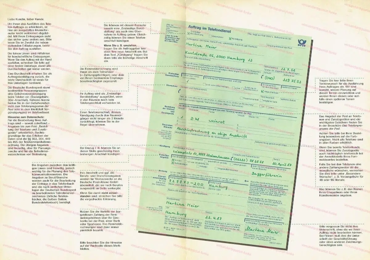 guter bis sehr guter Zustand, geringe Gebrauchs- und Alterungsspuren: Papier teils etwas vergilbt, aber Seiten sauber und ordentlich - teils leicht angeknickt, Anleitung für das Ausfüllen des Formulars, Rückseite: Hinweise für die Teilnahme am Lastschrifteinzug für Beträge der Fernmelderechnung, kartoniert, ca. 21 x 31,5, 4 Seiten