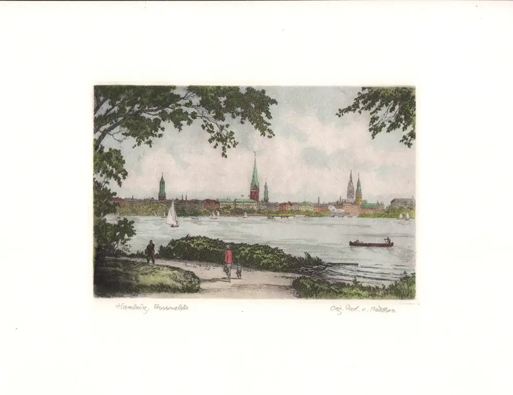Außenalster in Hamburg [II]. Handkolorierte Original-Radierung, Mühlhan, Adolf