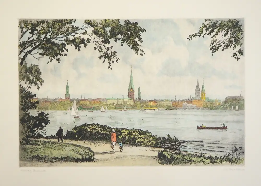 Außenalster in Hamburg [II]. Handkolorierte Original-Radierung, Mühlhan, Adolf