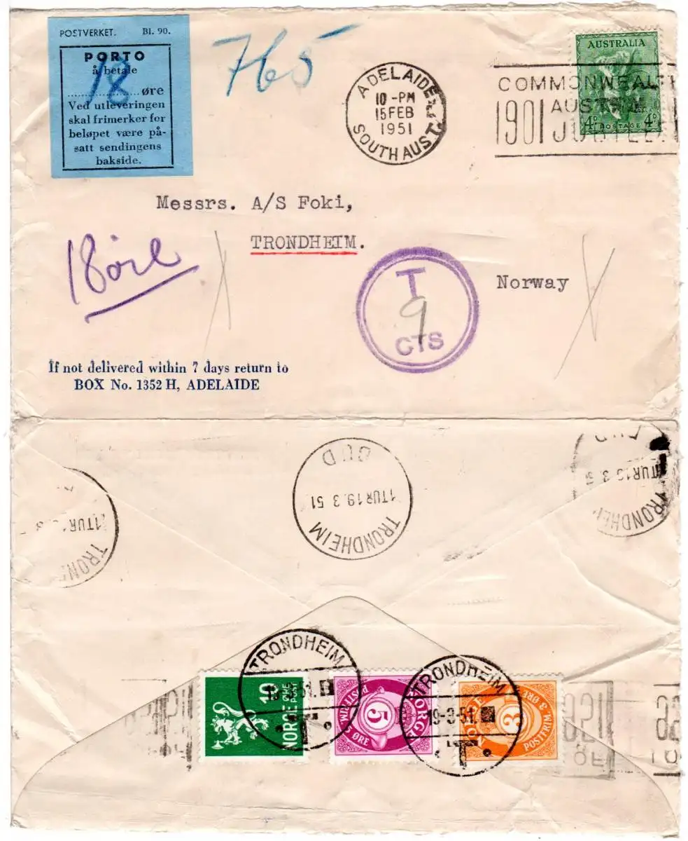 Australien 1951, 4d auf Brief v. Adelaid mit 3 Norwegen Porto-Marken