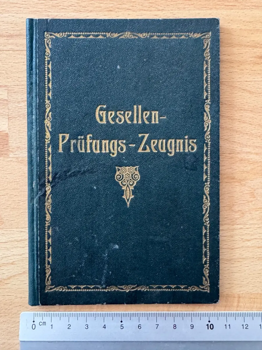 Das Zeugnisheft ist in dunkelgrünem Kunstledereinband mit goldgeprägter Schrift gestaltet und stammt aus dem Druckhaus Wilhelm Grun, Crefeld. Innen befindet sich die original handschriftliche Eintragung des Gesellenprüfungsausschusses der Schneiderinnen Innung Rheydt, unterschrieben von Meisterin Helene Scholz, Meister Josef Wipper und Vorsitzender Luise Behle.
