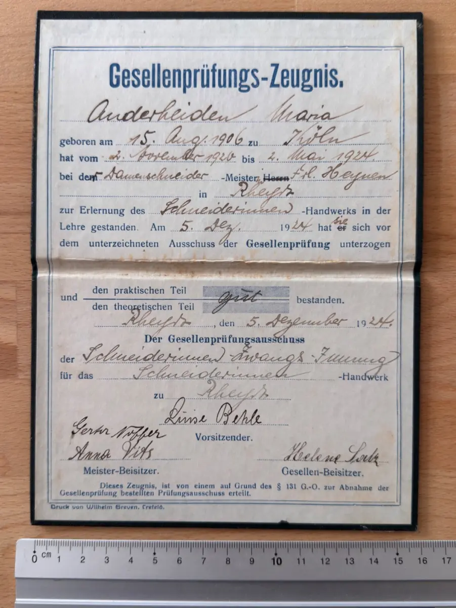 Originales Gesellen Prüfungs Zeugnis der Schneiderin Maria Anderheiden aus Rheydt, datiert auf den 5. Dezember 1924. Dieses historische Dokument belegt den erfolgreichen Abschluss der Gesellenprüfung im Damenschneider Handwerk mit der Note gut.
