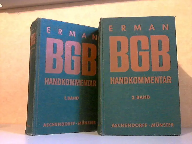 beide Bände sind ein Dachbodenfund, Bibliotheksexemplar mit Stempel und Rückständen, gebräunt, fleckig, Einbände abgegriffen an den Ecken und Kanten teils stärker bestoßen, 1.BAND: Vorwort - Verzeichn is der Abkürzungen - Kommentar - Bürgerliches Gesetzbuch, Erstes Buch, Zweites Buch - Gesetz betreffend die Abzahlungsgeschäfte cm 16. Mai - Verschollenheitsgesetz vom 4. 7. 1939 - Gesetz zur Änderung von Vorschriften des Verschollenneitsrecnts vom 15. 1. 1951. 2. BAND: Bürgerliches Gesetzbuch, Drittes Buch, Viertes Buch, Fünftes Buch - Einführungsgesetz zum Bürgerlichen Gesetzbuch - Gesetz über das Wohnungseigentum und das Dauerwohnrecht (Wohnungseigentumsgesetz)vom 15.März 1951 - Gesetze über Rechte an eingetragenen Schiffen und Schiffsbauwerken vom 15. November 1940 - Ehegesetz (Kontrollratsgesetz Nr. 16) vom 20. Februar 1946 - Verordnung über die Behandlung der Ehewohnung und des Hausrats nach der Scheidung (Hausratsverordnung) (Sechste Durchführungsverordnung zum Ehegesetz) vom 21. Oktober 1944 - Alphabetisches Stichwortverzeichnis Beschreibung vom Antiquariat Ardelt 1o5 ISBN-Nummer: 3402042703 Antiquariat Ardelt