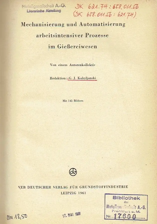 guter Zustand, Gebrauchs- und Alterungsspuren: ehemaliges Bibliotheksexemplar - Beide Deckel teils mit abgezogener Oberfläche nach unsachgemäßem Entfernen eines Aufklebers - Titel mit Stempeln und Notizen - Deckel innen mit kleinem Oberflächenschaden - Vorsatz und Schmutztitel mit weiterem Stempel - Papier teils etwas vergilbt, aber Seiten sauber und ordentlich - Einbandecken gering abgenutzt - Seiten teils etwas eselsohrig, Der erste Siebenjahrplan der Deutschen Demokratischen Republik stellt allen Werktätigen gewaltige Aufgaben, deren Lösung dazu beiträgt, der gesamten Bevölkerung der Deutschen Demokratischen Republik ein Leben voller Wohlstand und Glück zu schaffen. Eine wesentliche Voraussetzung für die Erreichung der im Siebenjahrplan gesteckten Ziele ist die breite Anwendung des Hauptweges der sozialistischen Rekonstruktion. Nur durch eine komplexe Mechanisierung und die Nutzung aller betrieblichen Reserven ist es möglich, die Steigerung der Arbeitsproduktivität planmäßig durchzuführen. Die komplexe Mechanisierung setzt jedoch eine Bereinigung des Produktionssortiments, eine Konzentrierung der Produktion und eine Spezialisierung der einzelnen Werke voraus. Auf diesem Gebiet gilt es besonders, im Industriezweig Giessereien auf schnellstem Wege die durch die kapitalistischen Verhältnisse entstandene Zersplitterung der Gussproduktion zu überwinden und Giessereien zu schaffen, die in der Lage sind, den ständig steigenden Bedarf der gussverarbeitenden Industrie quantitativ und qualitativ zu decken- Wie schon so oft, unterstützt die Sowjetunion unsere Republik auch bei dieser Arbeit. Das vorliegende Buch behandelt die Möglichkeiten der Mechanisierung und Automatisierung arbeitsintensiver Prozesse im Gießereiwesen und stützt sich besonders auf die Erfahrungen der sowjetischen Giesser des Leningrader Gebiets, Halbkunstleder, ca. 16,5 x 23,5, 196 Seiten mit 145 Bildern