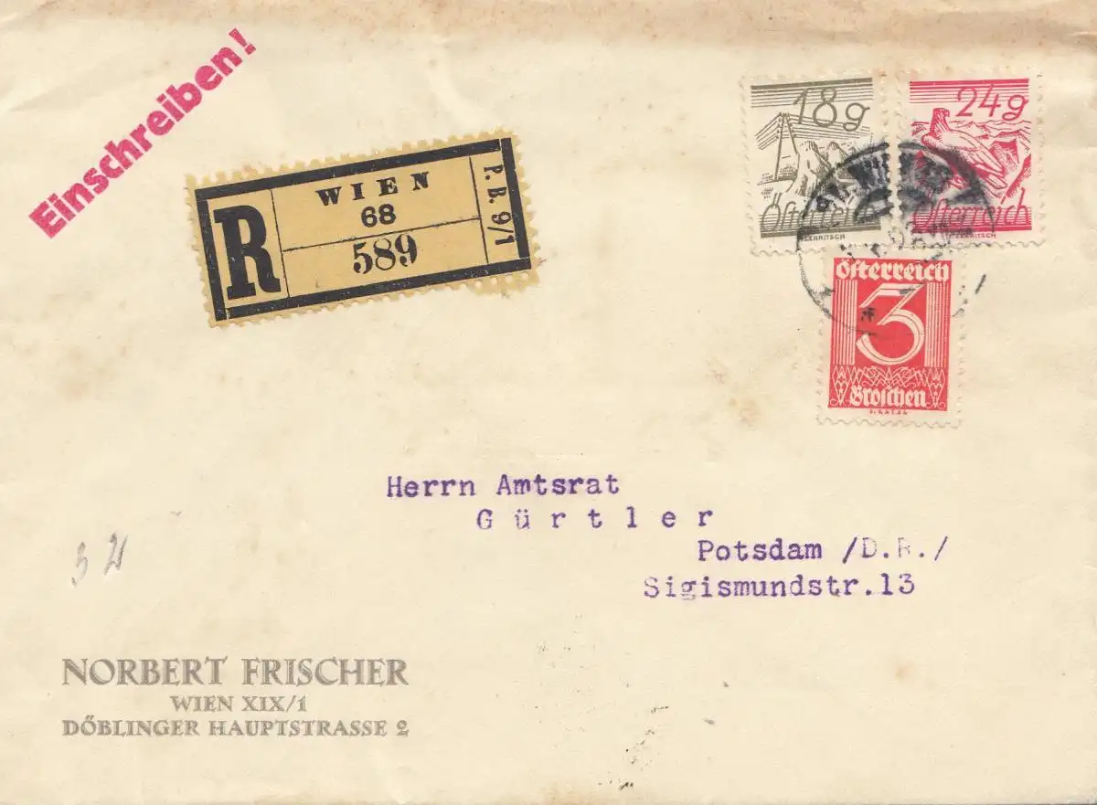 Autriche: 1920: Lettre recommandé Vienne après Postsdam
