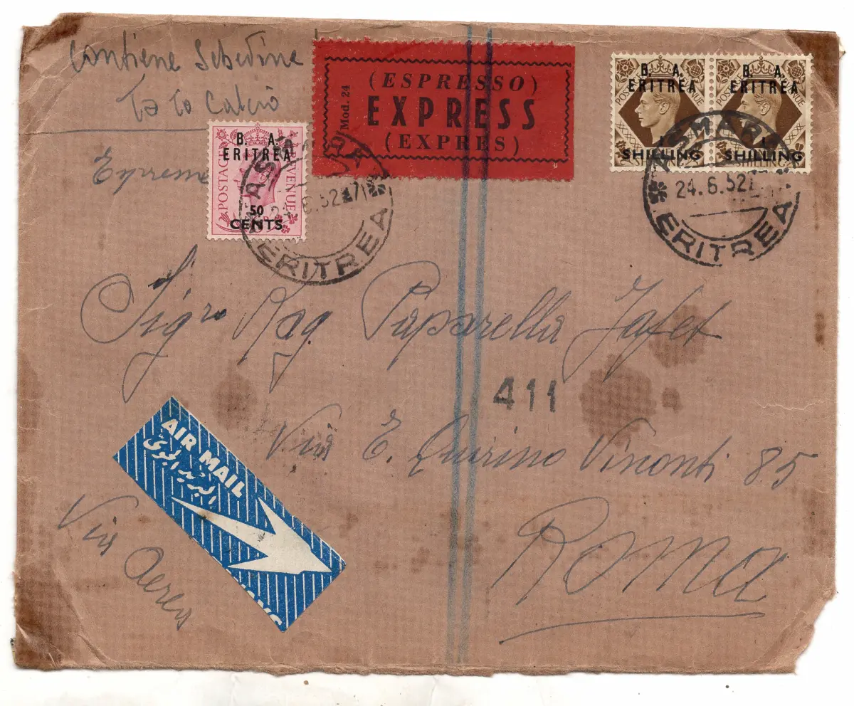Umschlag - B. A. Eritrea - Express-Luftumschlag von Asmara nach Rom am 24.6.52 frankiert mit 50 Cent. Nr. 20 + 1 sh Drehmoment. Nr. 23 - auf der Rückseite Express-Lieferetikett und Ankunftsstornierung - Interessanter Cod. 2820/WEB