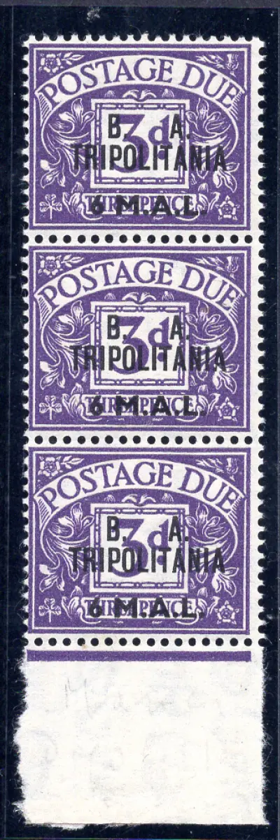 B.A. Tripolitanien - Steuermarken 6 Mal ohne Punkt nach B Vollgummi - B.A. Tripolitanien - Steuermarken 6 Mal Nr. 9b Streifen von drei b. von f. mit dem Exemplar in der Mitte ohne Punkt nach der B - Kat. 195 Code Nr. 767/4