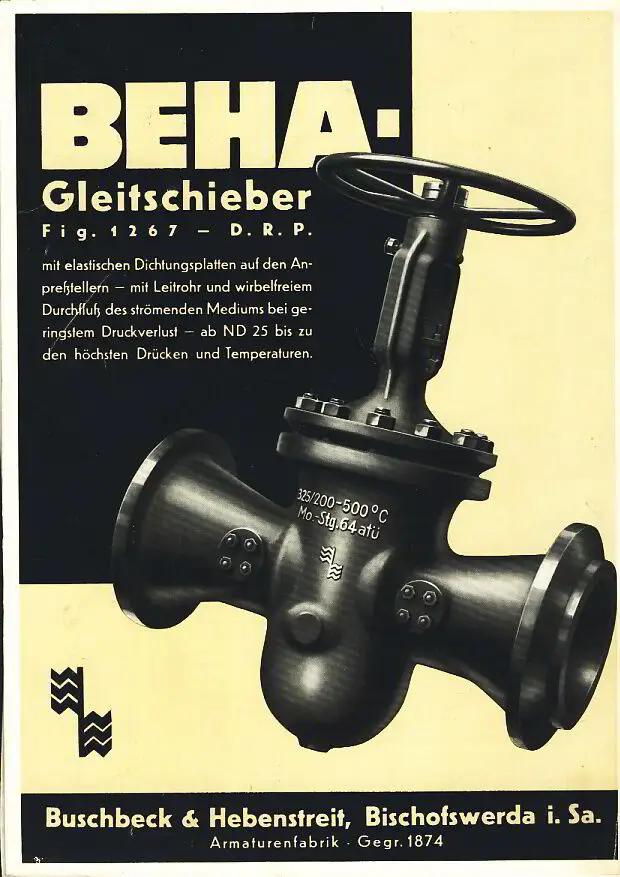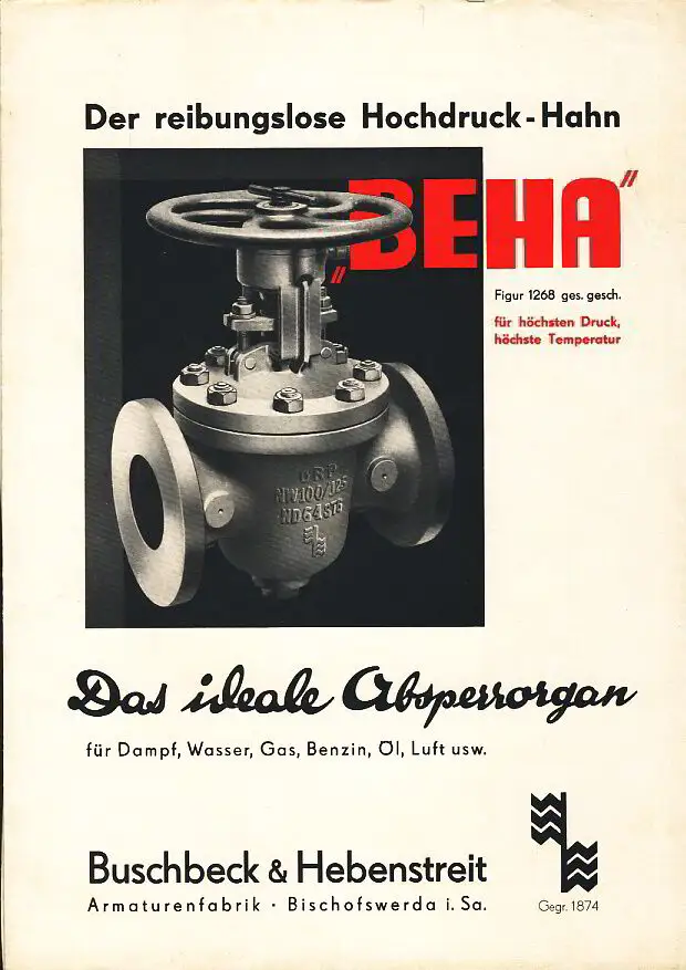 guter bis sehr guter Zustand, geringe Gebrauchs- und Alterungsspuren, BEHA Leichtschalt-Hähne für alle Medien und alle Drücke (20 Seiten mit vielen Bildern) - BEHA Gleitschieber (4 Seiten mit 6 Bildern - Druckschrift Nr. 11 Kcd 10-3129) - Der reibungslose Hochdruck-Hahn "BEHA" (4 Seiten mit 5 Bildern - Druckschrift Nr. 22 K/83615) Die Firma in Bischofswerda war ein Zweigbetrieb der 1874 in Dresden-Löbtau gegründeten Firma Buschbeck und Hebenstreit. Die Gründer waren Hermann Adolph Buschbeck und Friedrich Emil Hebenstreit. Das Unternehmen stellte Armaturen aus Metall, Eisen- und Stahlguss für Heizung, Dampf, Wasser und Gas her. Auf der Grundlage des Volksentscheids in Sachsen vom 30.06.1946 wurde die Firma enteignet und in Volkseigentum überführt. Der Betrieb firmierte dann als VEB Armaturenwerk Bischofswerda. (Quelle: Hauptstaatsarchiv Dresden), Papier / kartoniert, ca. A4
