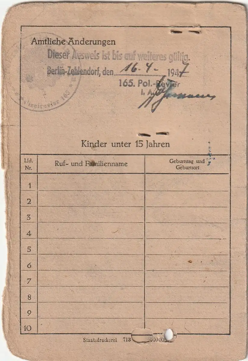 DOKUMENT - AUSWEIS, Vorläufiger Personalausweis, Berlin - Zahlendorf 1946, verlängert 1947