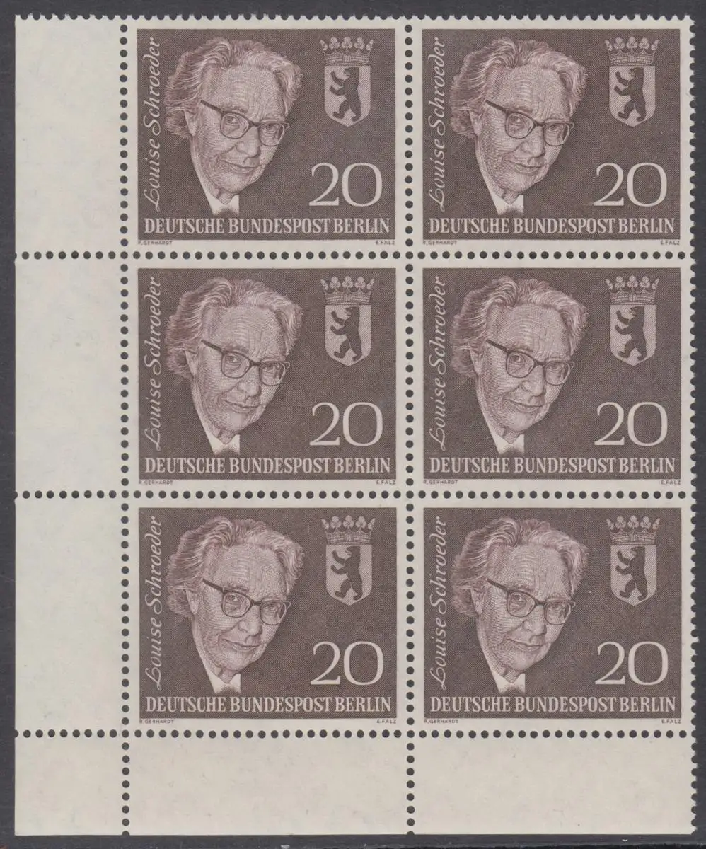 BERLIN 1961 Michel-Nummer 198 postfrisch vert.BLOCK(6) ECKRAND unten links - Todestag von Louise Schröder, Politikerin