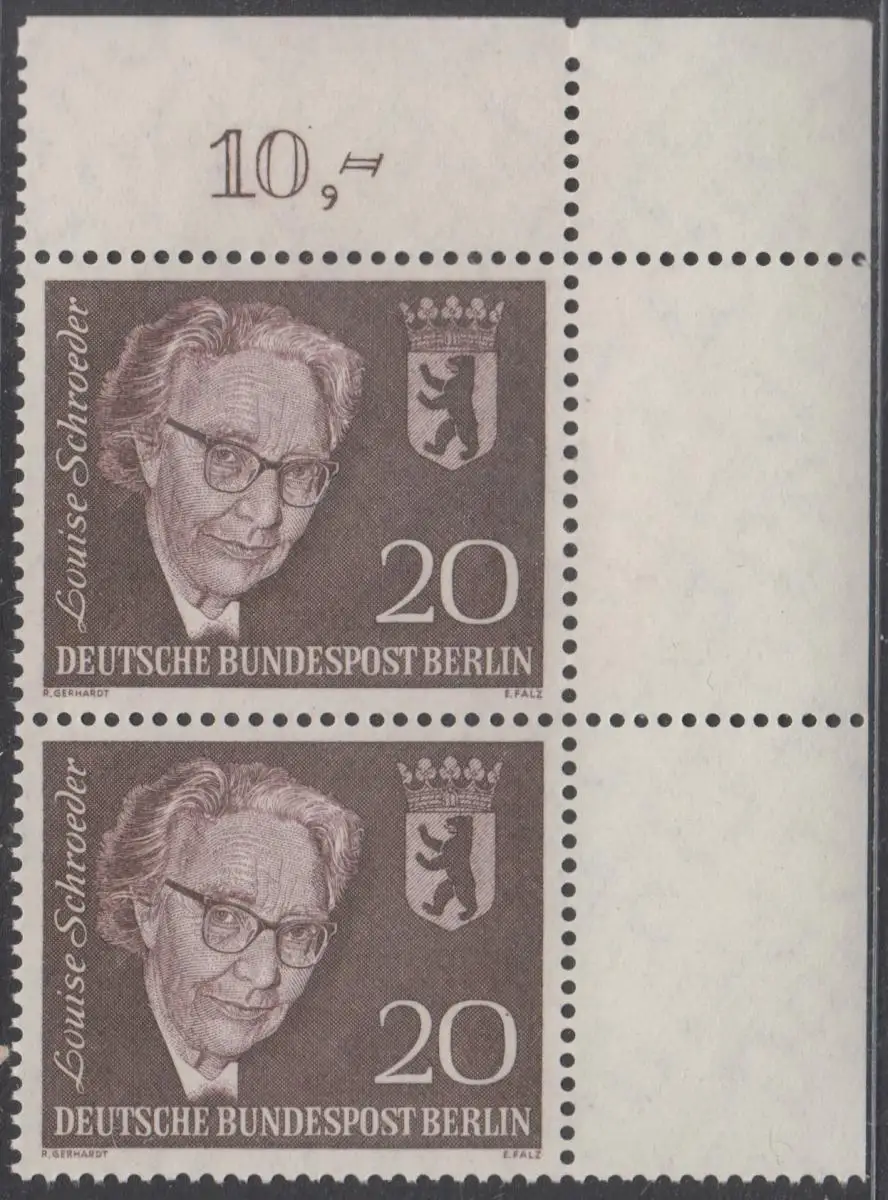 BERLIN 1961 Michel-Nummer 198 postfrisch vert.PAAR ECKRAND oben rechts - Todestag von Louise Schröder, Politikerin