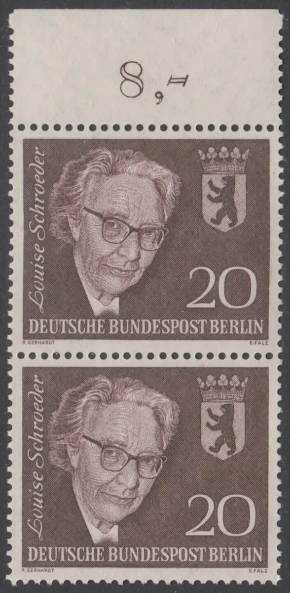 BERLIN 1961 Michel-Nummer 198 postfrisch vert.PAAR RAND oben (c) - Todestag von Louise Schröder, Politikerin
