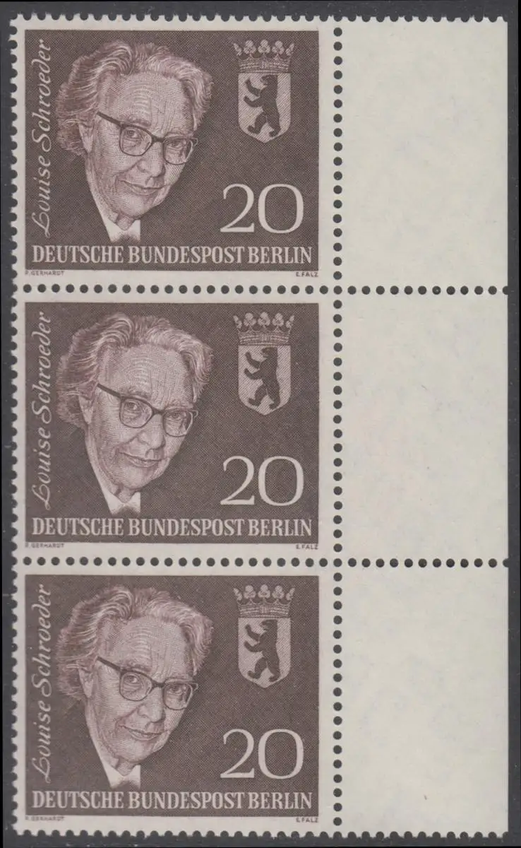 BERLIN 1961 Michel-Nummer 198 postfrisch vert.STRIP(3) Ränder rechts - Todestag von Louise Schröder, Politikerin