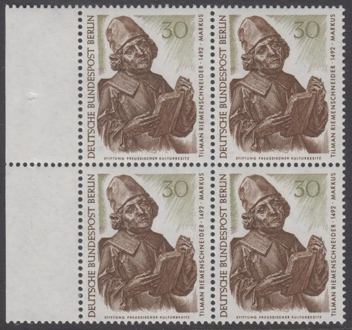 BERLIN 1967 Michel-Nummer 305 postfrisch BLOCK RÄNDER links - Berliner Kunstschätze: Evangelist Markus, Detail des Münnerstädter Altars
