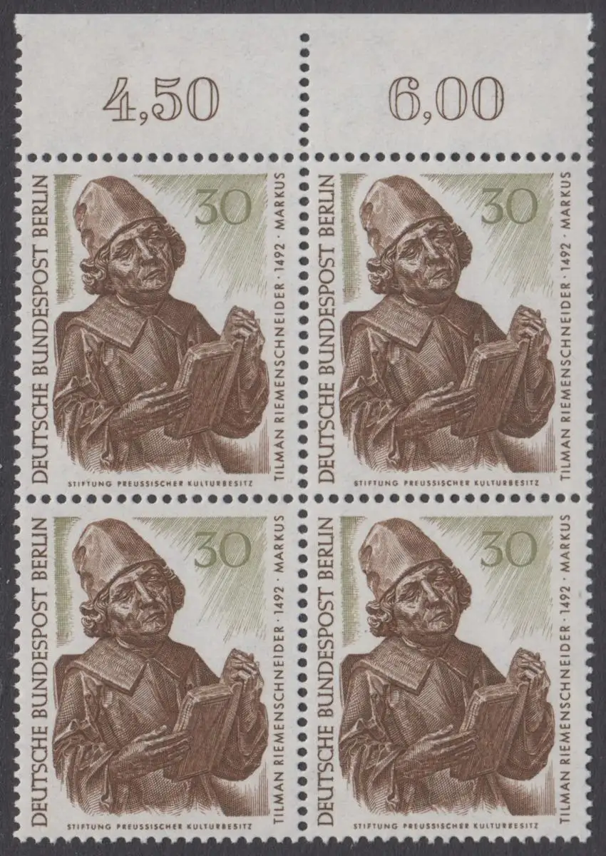 BERLIN 1967 Michel-Nummer 305 postfrisch BLOCK RÄNDER oben (a01) - Berliner Kunstschätze: Evangelist Markus, Detail des Münnerstädter Altars