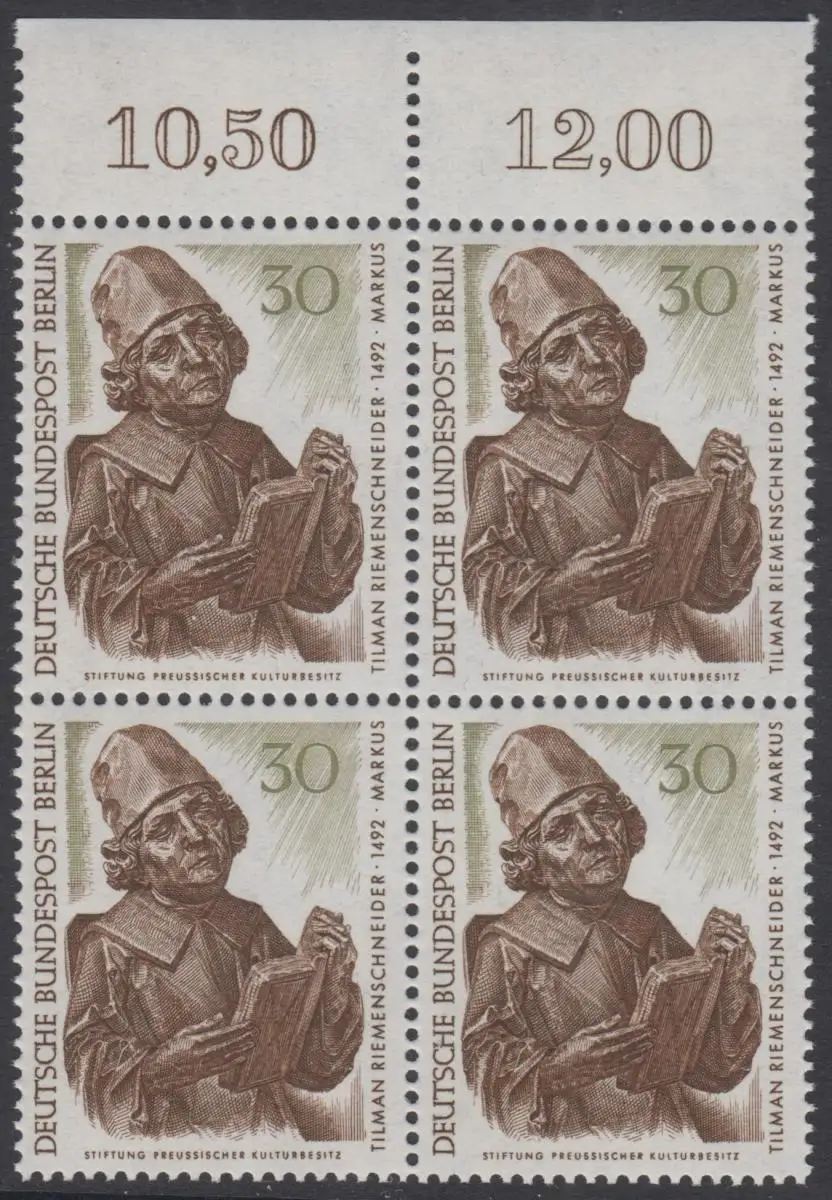BERLIN 1967 Michel-Nummer 305 postfrisch BLOCK RÄNDER oben (a03) - Berliner Kunstschätze: Evangelist Markus, Detail des Münnerstädter Altars