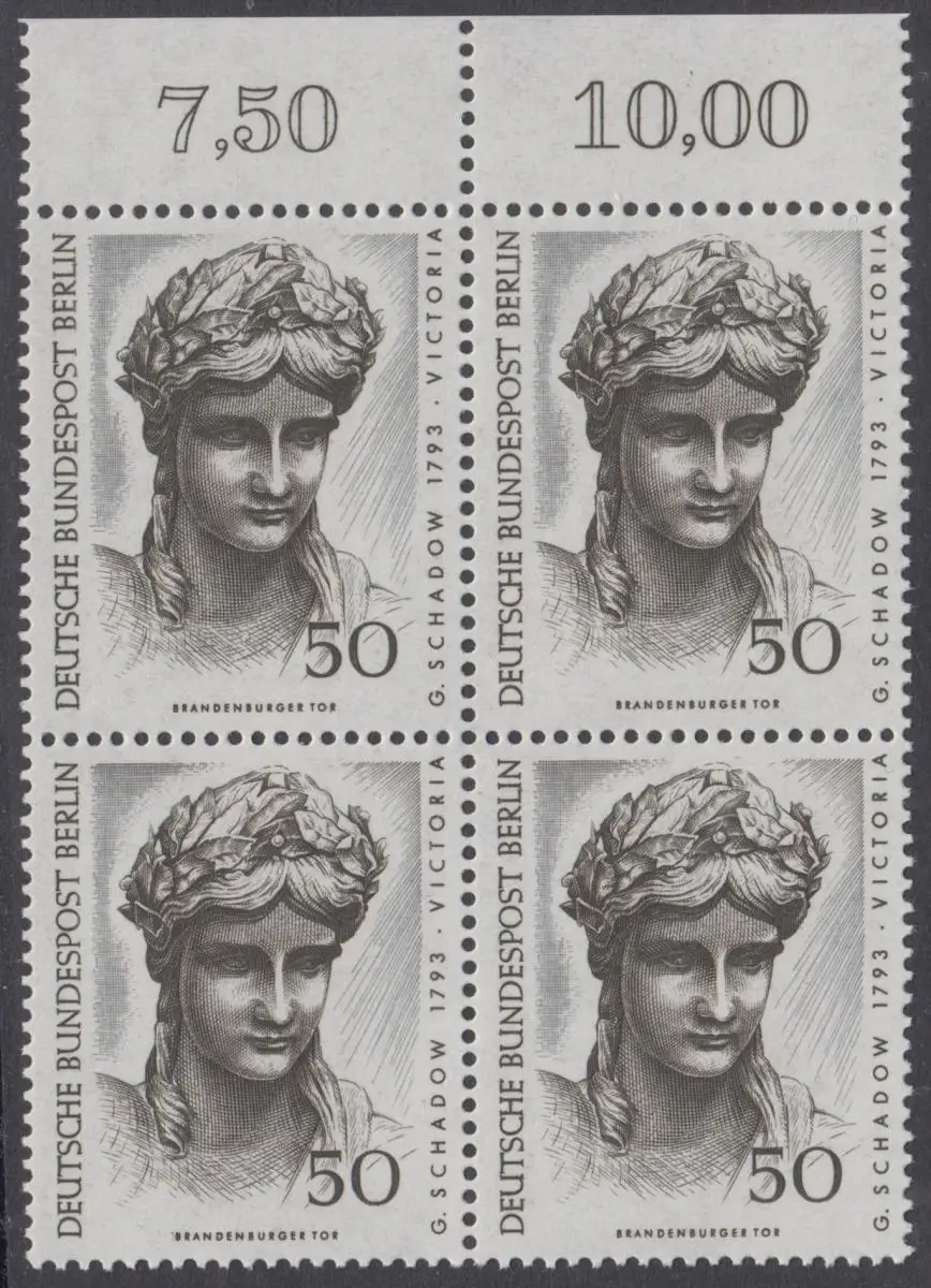 BERLIN 1967 Michel-Nummer 306 postfrisch BLOCK RÄNDER oben (a01) - Berliner Kunstschätze: Kopf der Victoria, Detail der Quadriga auf dem Brandenburger Tor
