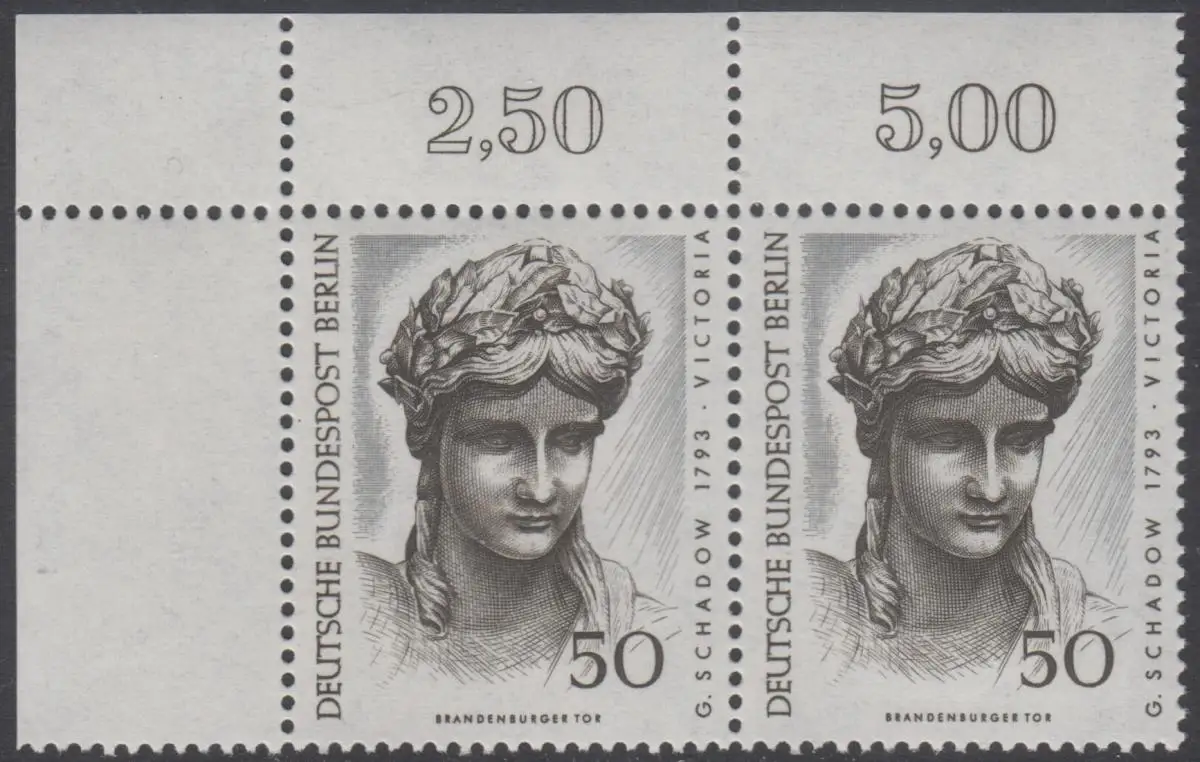 BERLIN 1967 Michel-Nummer 306 postfrisch horiz.PAAR ECKRAND oben links - Berliner Kunstschätze: Kopf der Victoria, Detail der Quadriga auf dem Brandenburger Tor