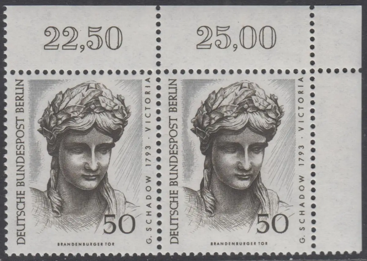 BERLIN 1967 Michel-Nummer 306 postfrisch horiz.PAAR ECKRAND oben rechts - Berliner Kunstschätze: Kopf der Victoria, Detail der Quadriga auf dem Brandenburger Tor