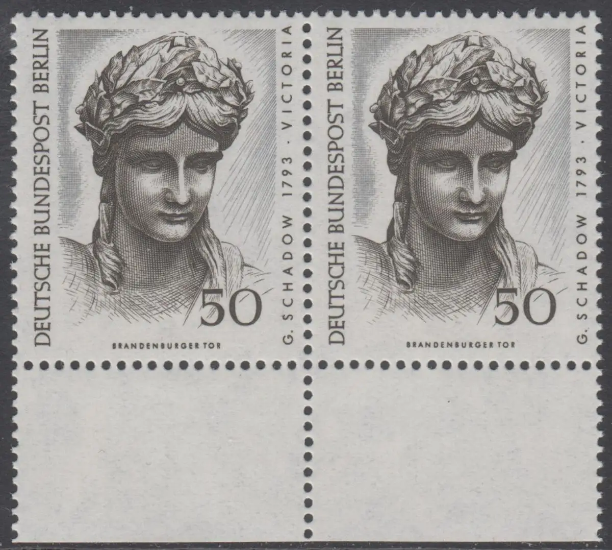 BERLIN 1967 Michel-Nummer 306 postfrisch horiz.PAAR RÄNDER unten - Berliner Kunstschätze: Kopf der Victoria, Detail der Quadriga auf dem Brandenburger Tor