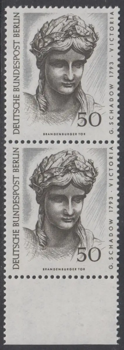 BERLIN 1967 Michel-Nummer 306 postfrisch vert.PAAR RAND unten - Berliner Kunstschätze: Kopf der Victoria, Detail der Quadriga auf dem Brandenburger Tor