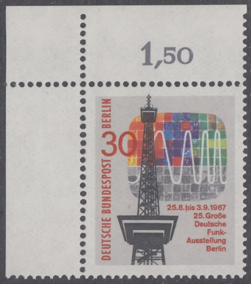 BERLIN 1967 Michel-Nummer 309 postfrisch EINZELMARKE ECKRAND oben links - Große Deutsche Funkausstellung, Berlin