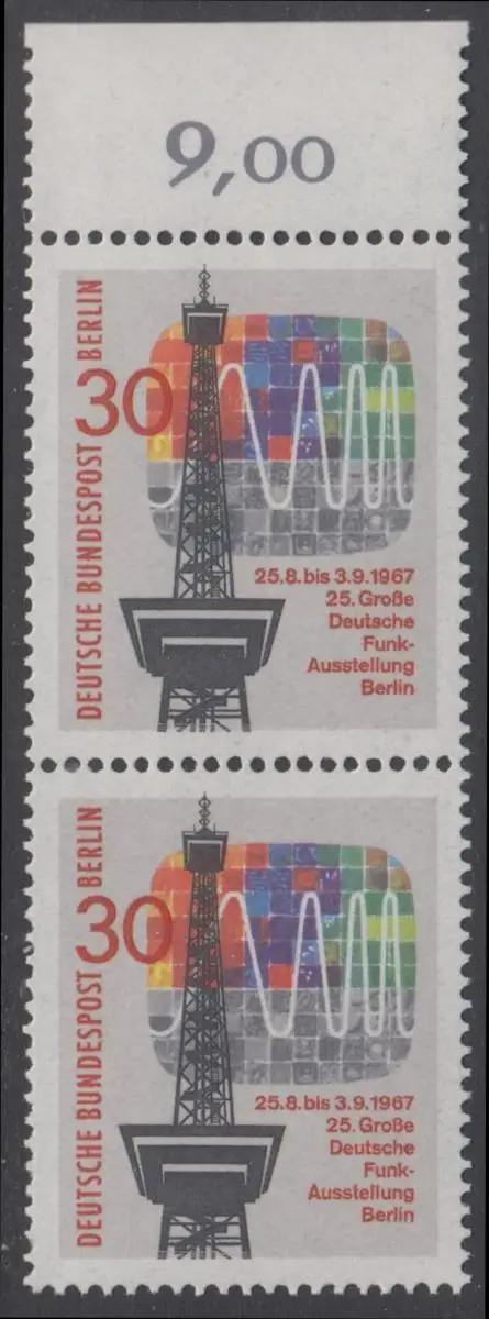 BERLIN 1967 Michel-Nummer 309 postfrisch vert.PAAR RAND oben (e) - Große Deutsche Funkausstellung, Berlin
