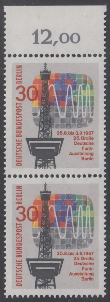 BERLIN 1967 Michel-Nummer 309 postfrisch vert.PAAR RAND oben (g) - Große Deutsche Funkausstellung, Berlin