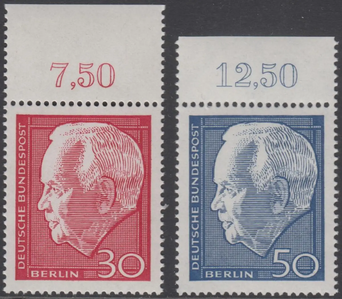 BERLIN 1967 Michel-Nummer 314-315 postfrisch SATZ(2) EINZELMARKEN RÄNDER oben (d) - Wiederwahl des Bundespräsidenten Heinrich Lübke