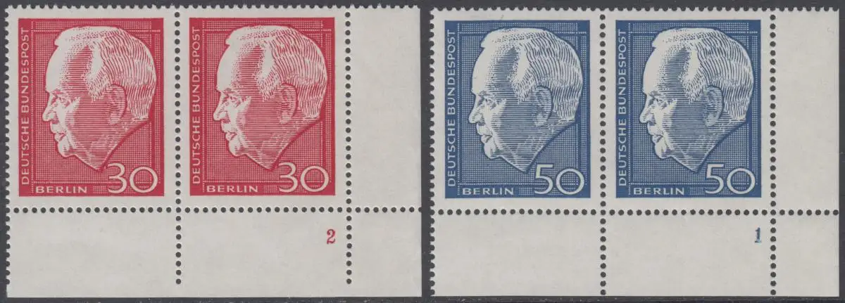 BERLIN 1967 Michel-Nummer 314-315 postfrisch SATZ(2) horiz.PAARE ECKRÄNDER unten rechts m/ Formnummer - Wiederwahl des Bundespräsidenten Heinrich Lübke