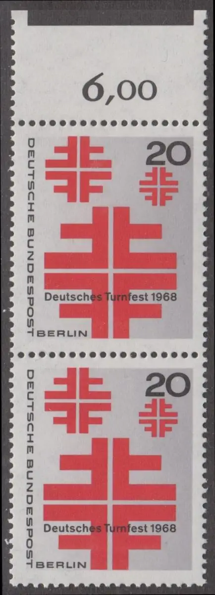 BERLIN 1968 Michel-Nummer 321 postfrisch vert.PAAR RAND oben (e) - Deutsches Turnfest, Berlin