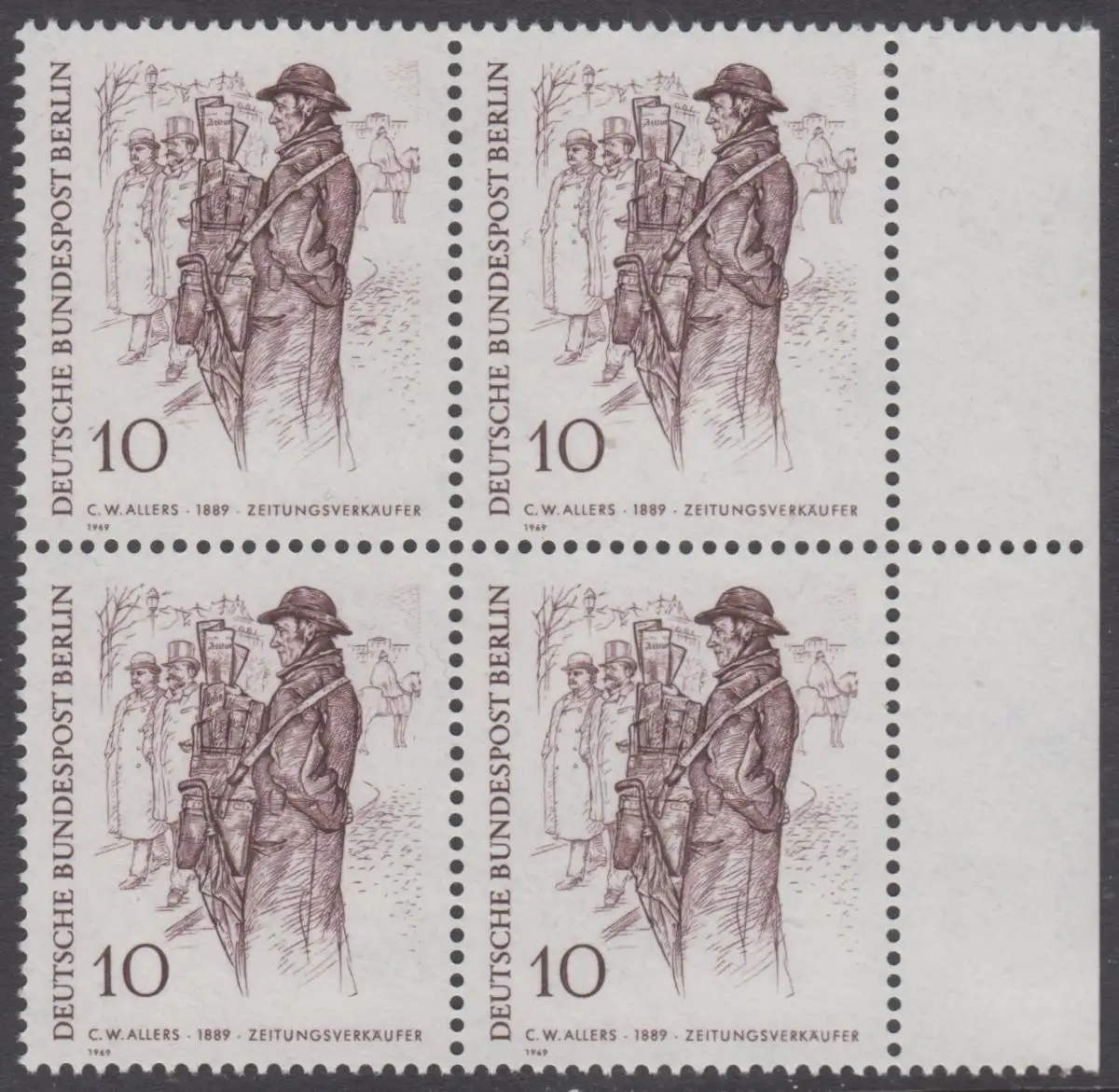 BERLIN 1969 Michel-Nummer 331 postfrisch BLOCK RÄNDER rechts - Berliner des 19. Jahrhunderts: Zeitungsverkäufer
