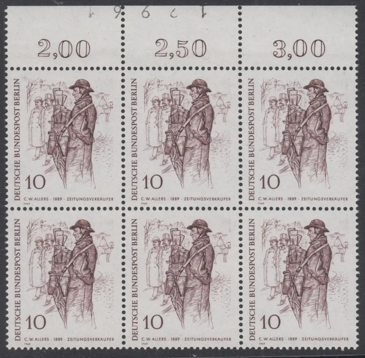 BERLIN 1969 Michel-Nummer 331 postfrisch horiz.BLOCK(6) RÄNDER oben m/ Bogenzähler - Berliner des 19. Jahrhunderts: Zeitungsverkäufer