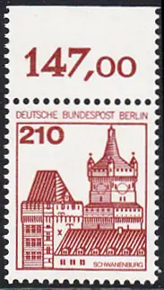 BERLIN 1978 Michel-Nummer 589 postfrisch EINZELMARKE RAND oben (d) - Burgen & Schlösser: Schwanenburg, Kleve