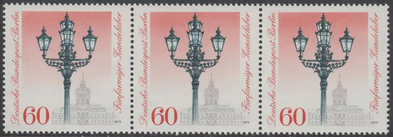 BERLIN 1979 Michel-Nummer 606 postfrisch horiz.STRIP(3) - Historische Straßenlaternen: Fünfarmiger Kandelaber