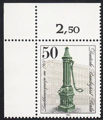 BERLIN 1983 Michel-Nummer 689 postfrisch EINZELMARKE ECKRAND oben links - Historische Straßenpumpen in Berlin: Lauchhammerpumpe, Klausenerplatz