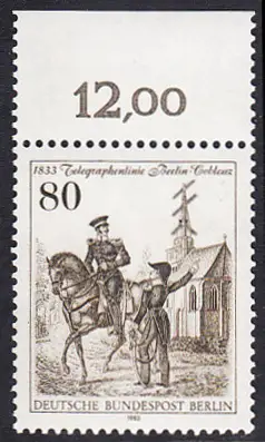BERLIN 1983 Michel-Nummer 693 postfrisch EINZELMARKE RAND oben (b) - Telegraphenlinie Berlin-Coblenz