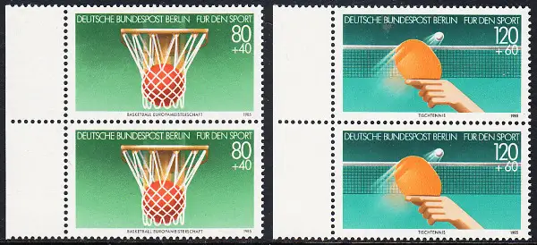 BERLIN 1985 Michel-Nummer 732-733 postfrisch SATZ(2) vert.PAARE RÄNDER links - Sporthilfe: Basketball-Europameisterschaft der Männer, Stuttgart, Leverkusen und Karlsruhe / 60 Jahre Deutscher Tischtennis-Bund (DTTB)