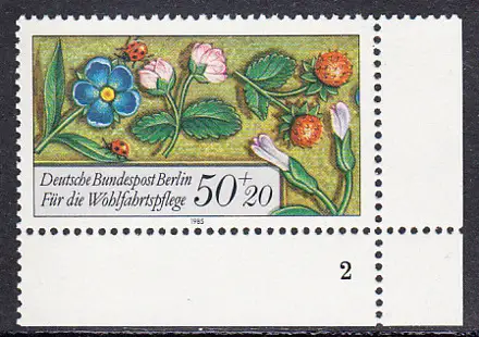 BERLIN 1985 Michel-Nummer 744 postfrisch EINZELMARKE ECKRAND unten rechts (FN) - Miniaturen: Streublumen, Beeren, Vögel und Insekten