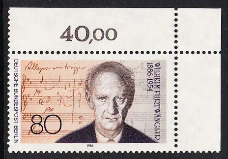 BERLIN 1986 Michel-Nummer 750 postfrisch EINZELMARKE ECKRAND oben rechts - Wilhelm Furtwängler, Dirigent und Komponist